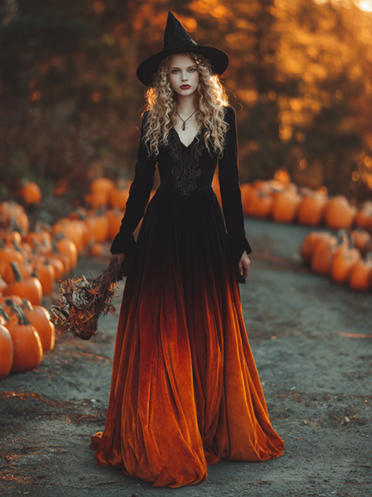 Women's Vintage Halloween Gradient Art Comfy Velvet Maxi Dress